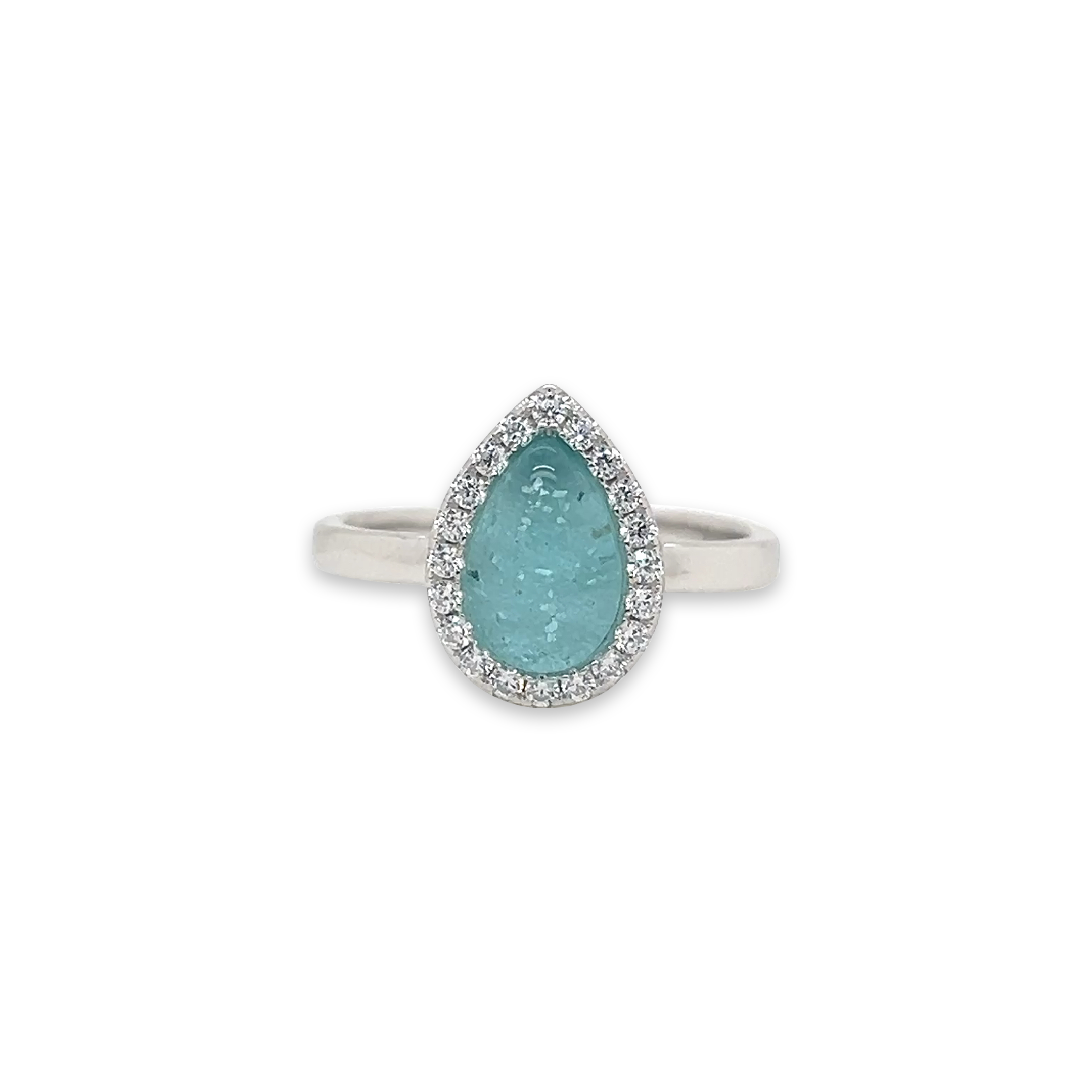 Each Alba Rose Honour Ashes Ring is lovingly handcrafted to hold cherished memories close. Within the radiant tones of our Aquamarine Murano glass, a small token of your loved one's ashes is carefully suspended, creating a gemstone that is as unique as the life it honours. Expertly made in our production studio crafted in Sterling Silver, this ashes into glass ring captures both beauty and remembrance in a single, timeless piece — a meaningful keepsake to wear every day, symbolising love, peace, and connection.