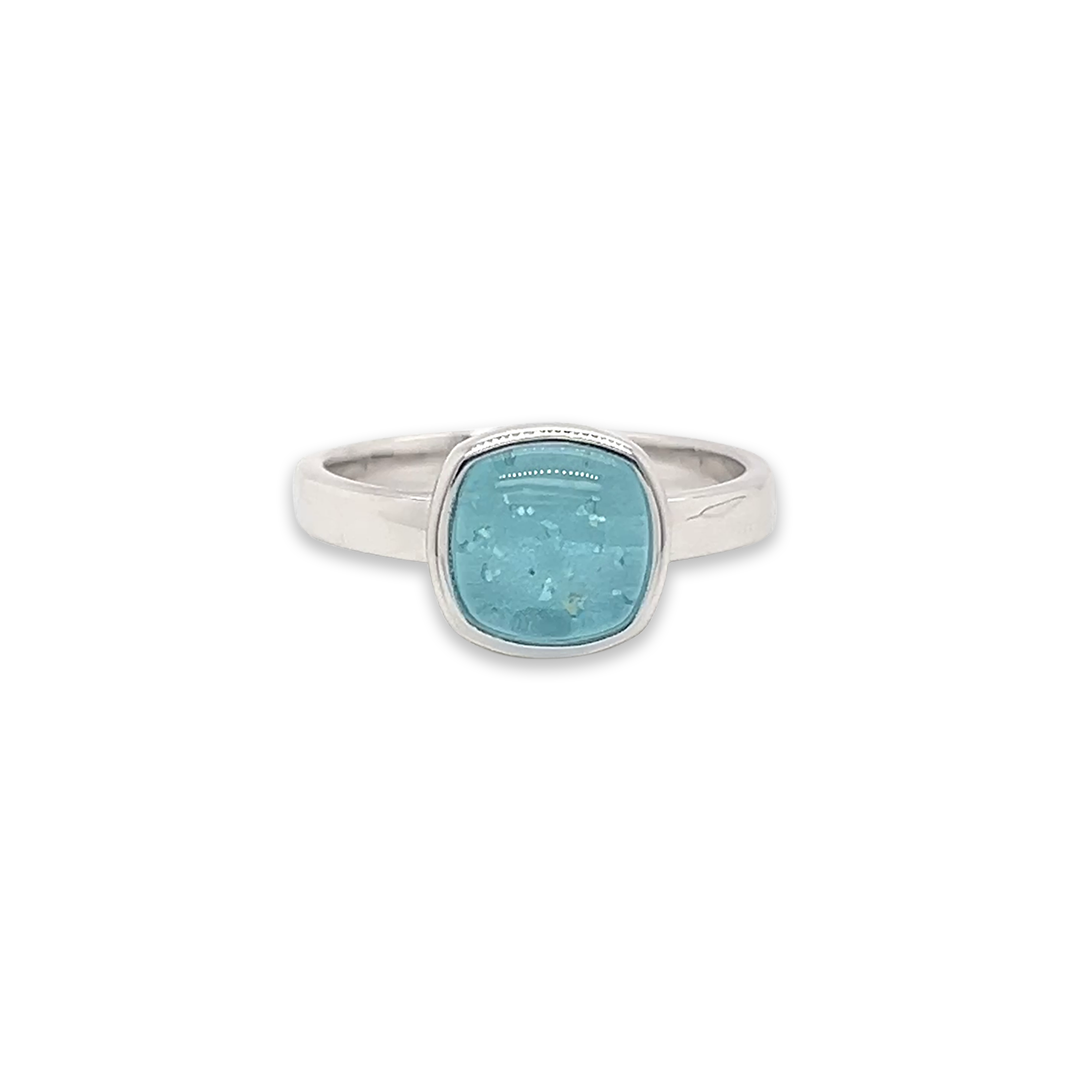 Each Alba Rose Comfort Ashes Ring is lovingly handcrafted to hold cherished memories close. Within the radiant tones of our Aquamarine Murano glass, a small token of your loved one's ashes is carefully suspended, creating a gemstone that is as unique as the life it honours. Expertly made in our production studio crafted in Sterling Silver, this ashes into glass ring captures both beauty and remembrance in a single, timeless piece — a meaningful keepsake to wear every day, symbolising love, peace, and connection.