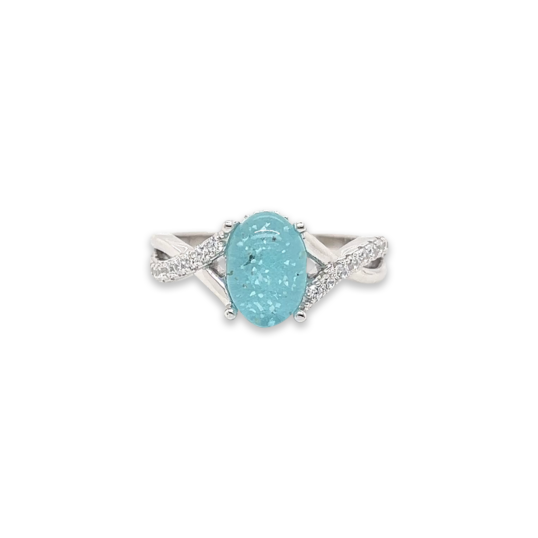 Each Alba Rose Amara Ashes Ring is lovingly handcrafted to hold cherished memories close. Within the radiant tones of our Aquamarine Murano glass, a small token of your loved one's ashes is carefully suspended, creating a gemstone that is as unique as the life it honours. Expertly made in our production studio crafted in Sterling Silver, this ashes into glass ring captures both beauty and remembrance in a single, timeless piece — a meaningful keepsake to wear every day, symbolising love, peace, and connection.