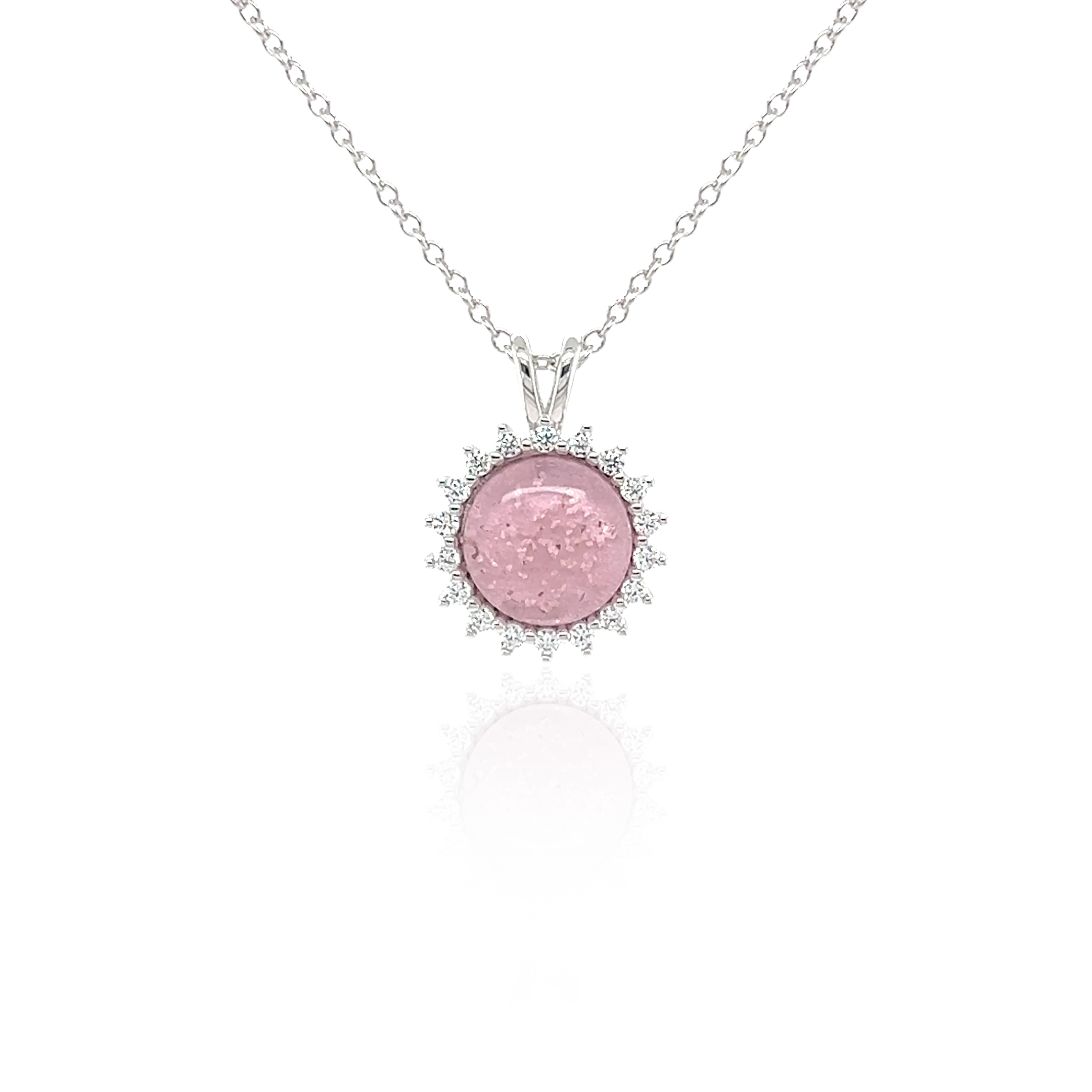 Each Alba Rose Always Ashes Pendant is lovingly handcrafted to hold cherished memories close. Within the radiant tones of our Rosalite Murano glass, a small token of your loved one's ashes is carefully suspended, creating a gemstone that is as unique as the life it honours. Expertly made in our production studio crafted in Sterling Silver, this ashes into glass pendant captures both beauty and remembrance in a single, timeless piece — a meaningful keepsake to wear every day, symbolising love, peace, and connection.